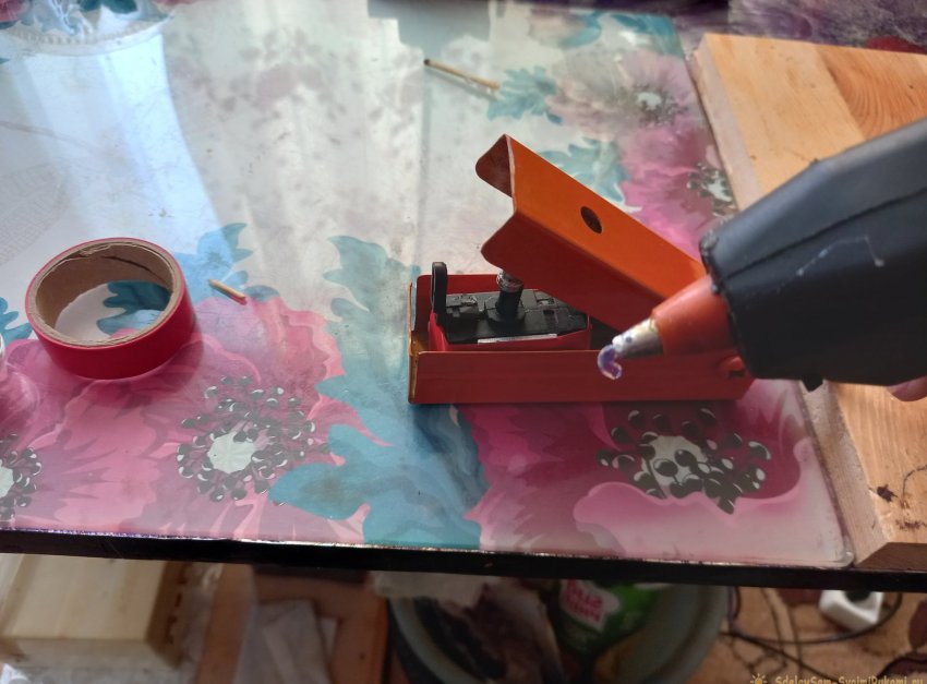 Если за время пайки, краска на корпусе успела просохнуть, то вкладываем как можно ближе к торцу выключатель, и крепим его горячим клеем.