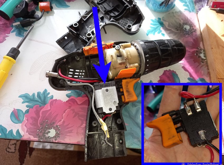 Для начала подготовим необходимый инструмент, и нужные детали для будущего выключателя. В качестве пускового механизма, с регулировкой оборотов и реверсом, я взял выключатель от старого, сломанного шуруповерта.