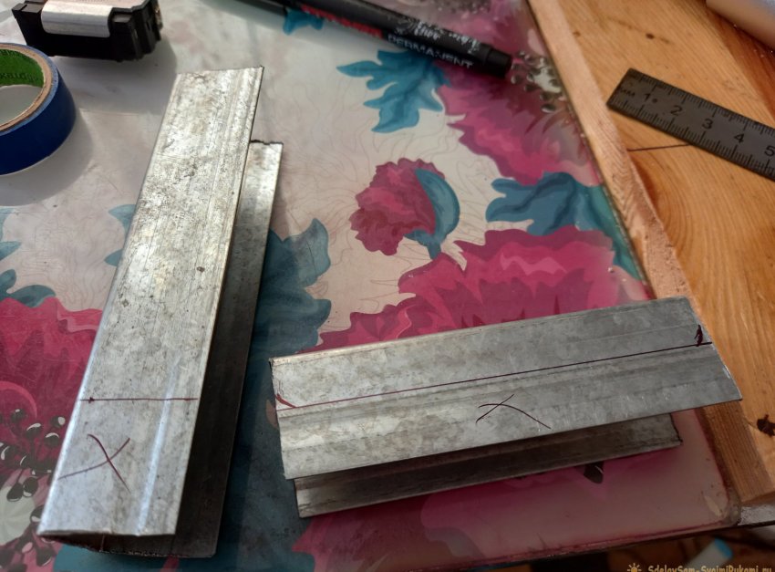 Теперь, у того отрезка что покороче, срезаем по одному сантиметру с каждой из стенок по всей длине, а у обрезка, что подлиннее, отступаем от одного из концов по 2,5 см (1 дюйм – ширина и высота профиля), и отрезаем обе стенки указанной длины, вот таким образом: