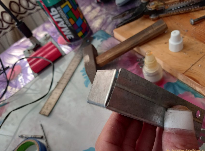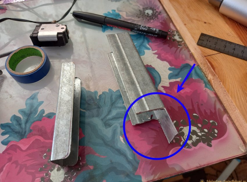 Приобрести такой выключатель можно и отдельно, в магазине электроинструментов. Стоит он копейки. Далее, подготовим части корпуса. Для этой цели я взял два отрезка металлического дюймового профиля, 8 и 11 см.