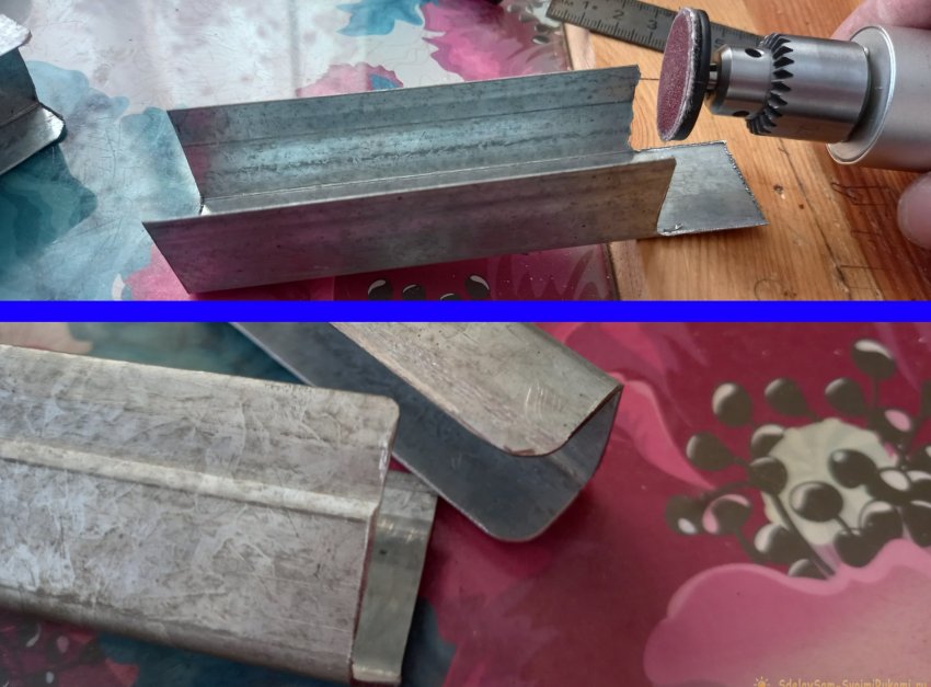 Нужно это для того, чтобы в дальнейшем подогнуть торчащий остаток внутрь, и получить торцевую стенку. Во избежание травм, с помощью шлифовальной головки, необходимо тщательно зашлифовать все заусеницы после резки, и скруглить углы.