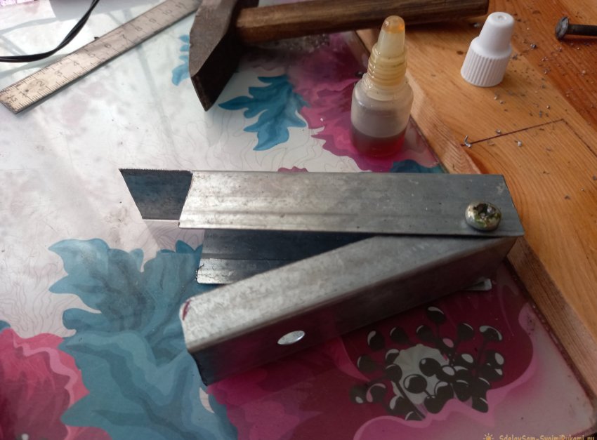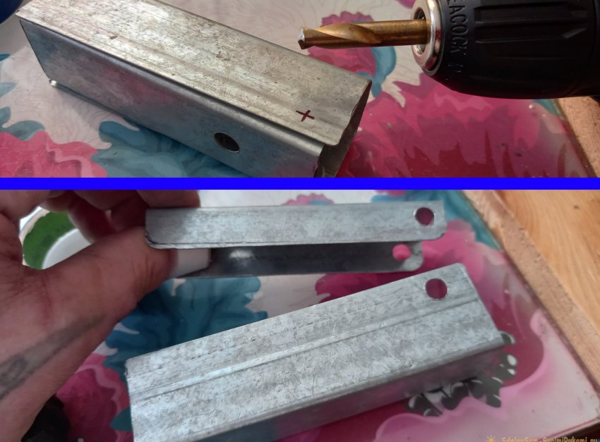 Вкладываем одну часть в другую, краями друг к другу, выравниваем, и сверлим сквозное отверстие.