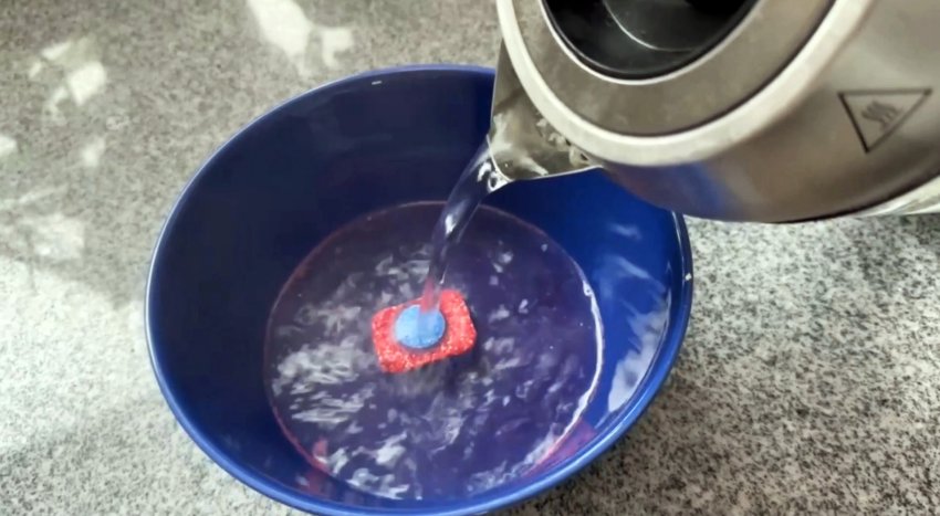Поместите таблетку для посудомоечной машины в миску и залейте горячей водой. Перемешивая, дождитесь полного растворения. Много воды не потребуется – достаточно и одного стакана.