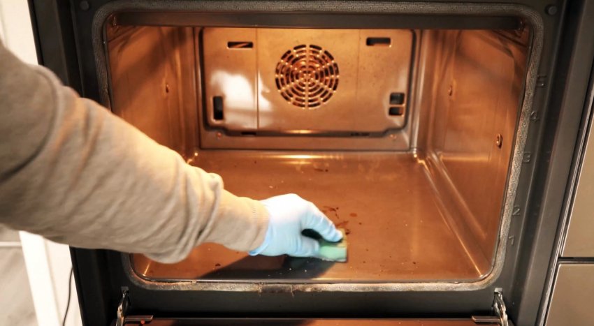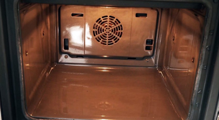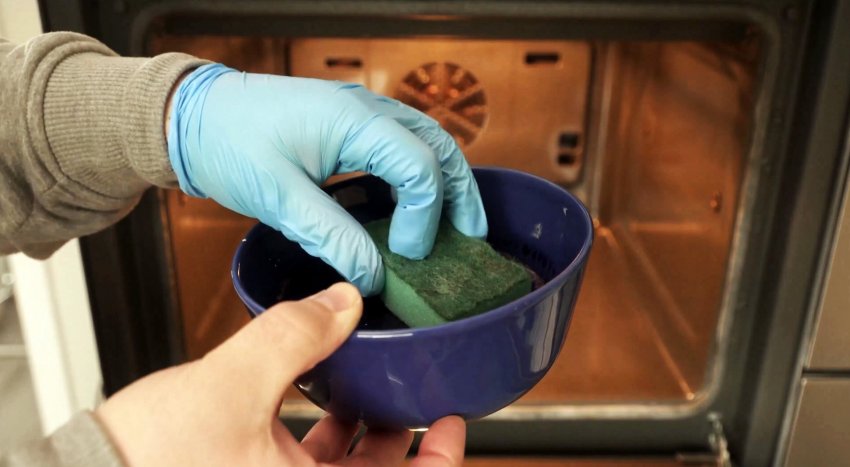 Смочите губку или хлопчатобумажную тряпочку в данном растворе, хорошо смажьте стенки, дно и верх духовки.