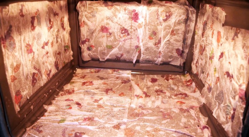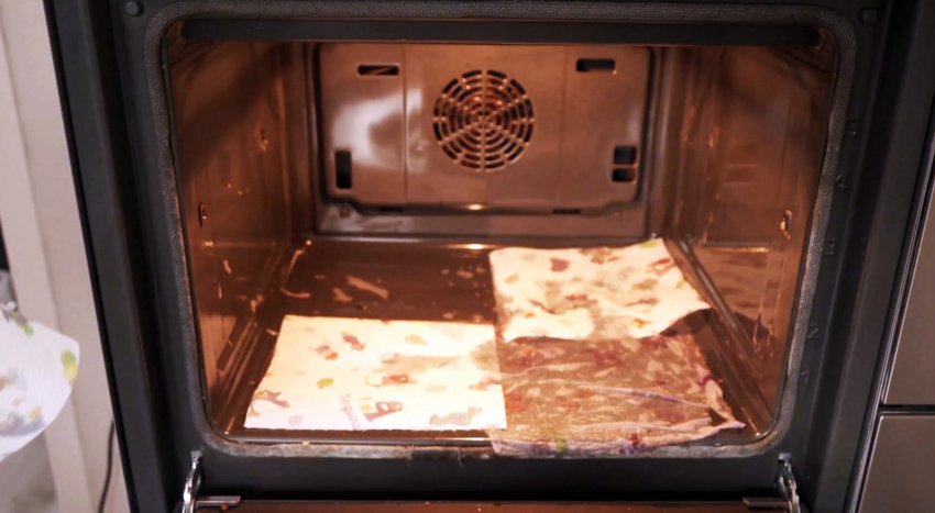Можно сначала разложить ткань, а уже потом пройтись сверху мокрой губкой, чтобы жидкость равномерно впиталась в салфетки. Но это удобно делать только на нижней поверхности. К бокам и к потолку лучше приклеивать уже влажные тряпочки. Не забудьте приклеить таким образом ткань и к дверце духовки.