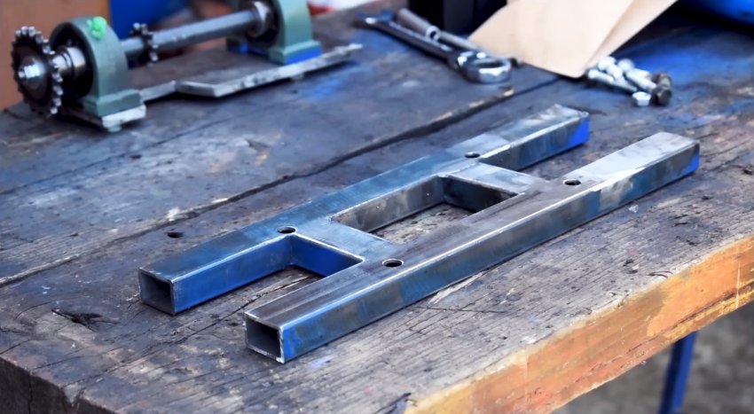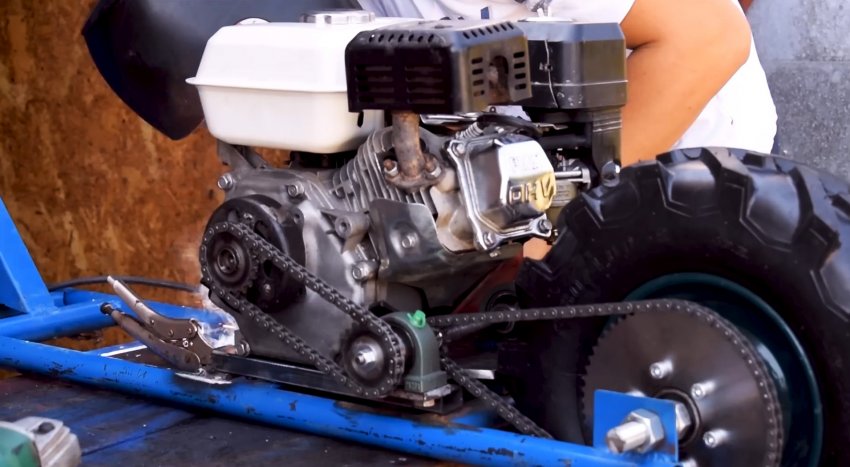 К корпусной раме привариваем поперечную пластину и устанавливаем двигатель и узел с промежуточными звездочками. Меньшую промежуточную звездочку и ведомую звездочку на колесе также соединяем цепью.