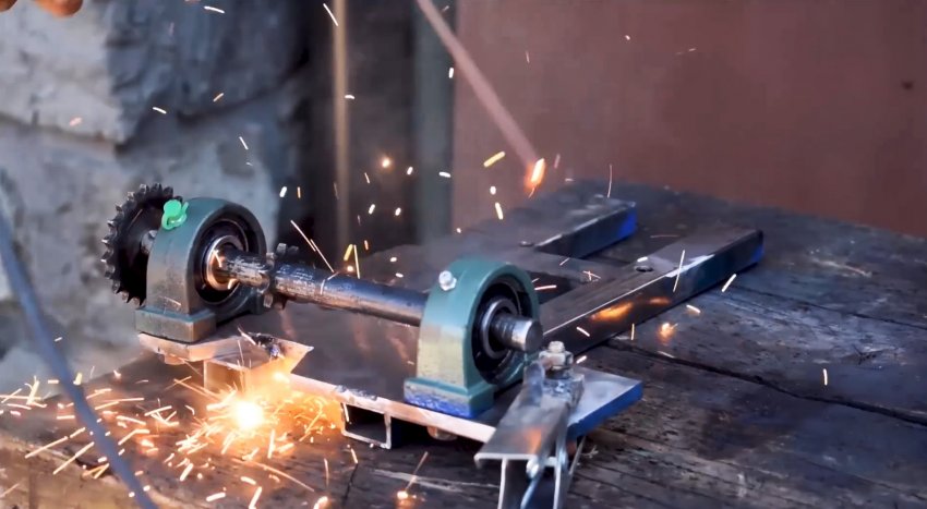 Наружную промежуточную звездочку привариваем к втулке и через широкую шайбу закрепляем на конце оси гайкой. Узел с промежуточными звездочками закрепляем за ножки подшипниковых опор к толстой плите так, чтобы вырез оказался между опорами.
