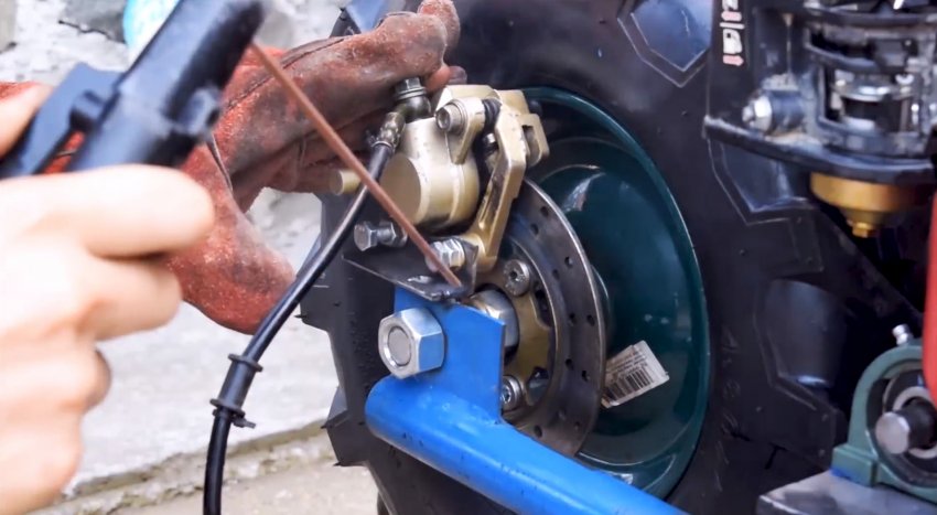 На тормозной диск устанавливаем тормозной механизм, закрепляя его сваркой к раме.
