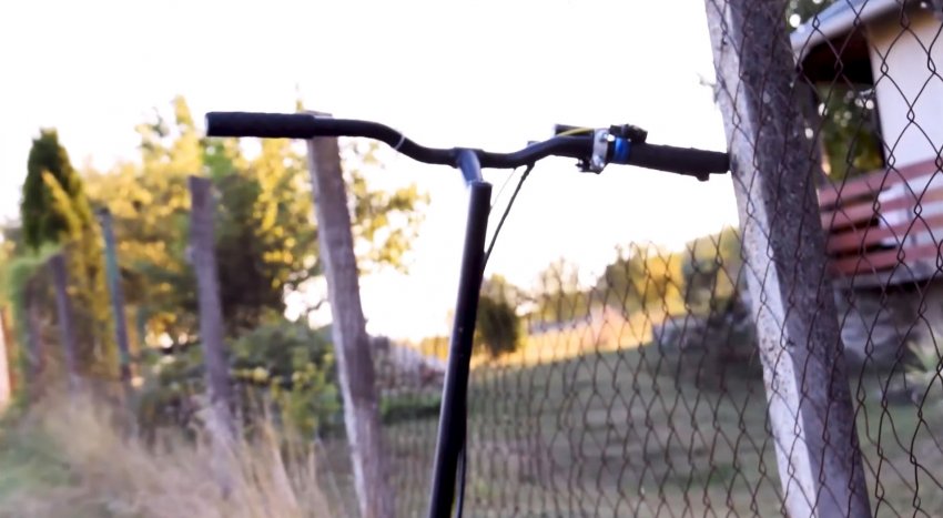 Крепим к передней вилке колесо, закрепляем органы управления тормозами и двигателем на руле. Мотосамокат полностью готов к работе.