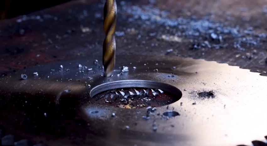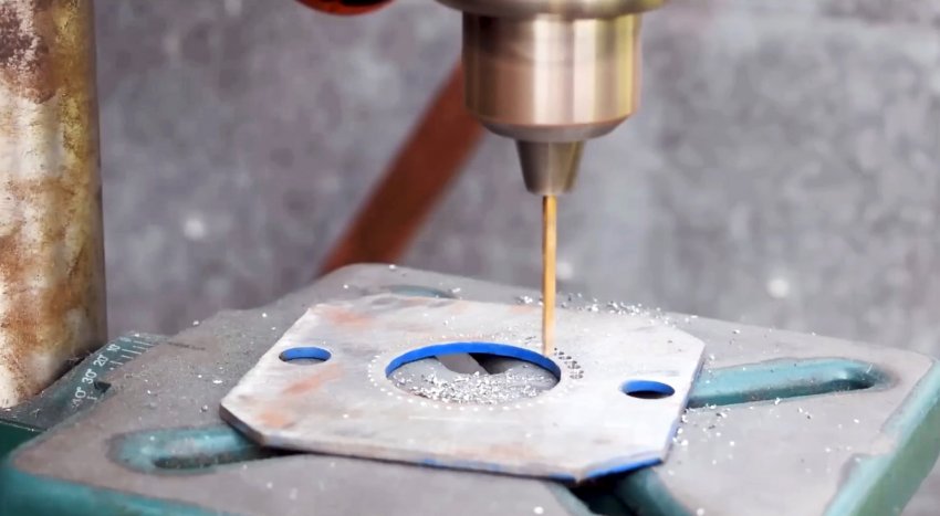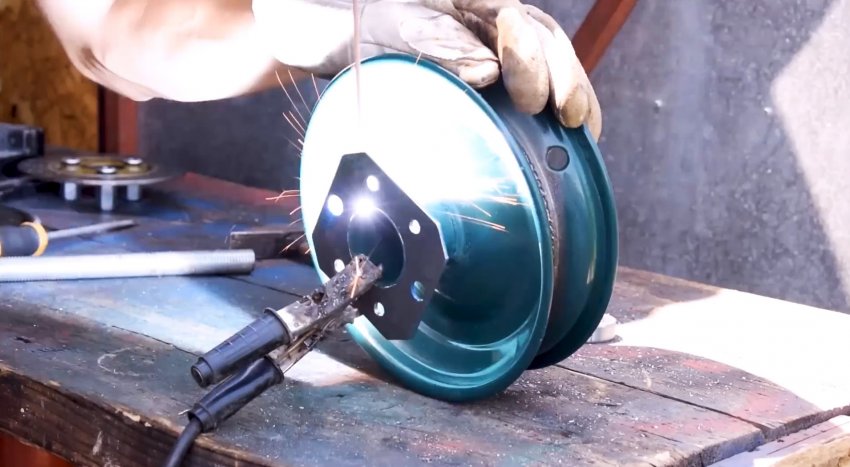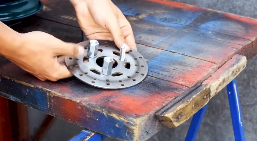 К ступице диска колеса подгоняем фланец из листовой стали в виде квадрата со срезанными углами и отверстием в центре. Накладываем на него бумажный шаблон, отмечаем центры отверстий под крепежные элементы и увеличение диаметра отверстия в центре путем сверления небольших отверстий, центры которых образуют 2 концентрические окружности на небольшом расстоянии друг от друга. Перемычки между отверстиями высверливаем сверлом побольше и удаляем ослабленный металл по окружности пассатижами. Оставшиеся выступы стачиваем напильником.