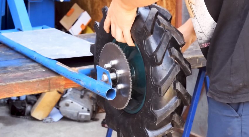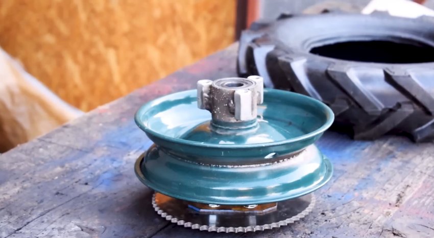 Устанавливаем на диск надувную шину диаметром 20 см от культиватора и возвращаем тормозной диск на место. Продеваем в подшипники ступицы диска ось, концы которой опираем на опоры в виде пластин с отверстиями.
