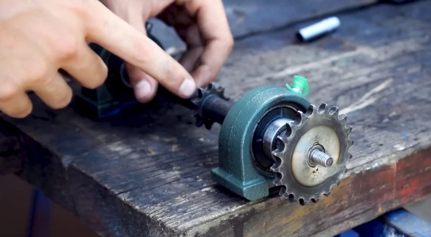 Собираем узел для промежуточных звездочек из двух подшипниковых опор, втулок и оси. Причем большую звездочку с 20 зубцами располагаем снаружи подшипниковой опоры, а меньшую с 10 зубцами – между опорами.