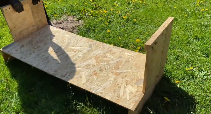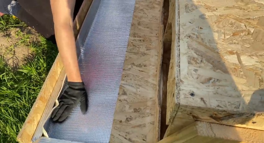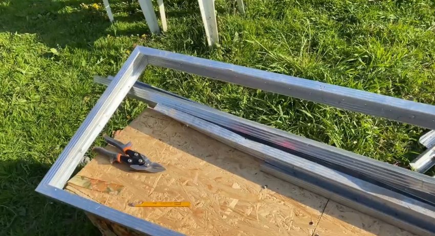 В П-образном металлическом профиле по разметкам вырезаем ножницами по металлу просечки и сгибаем его в раму прямоугольной формы. Крепим к полученной раме с уклоном на высоту профиля лист из OSB соответствующих размеров, используя деревянные бруски.