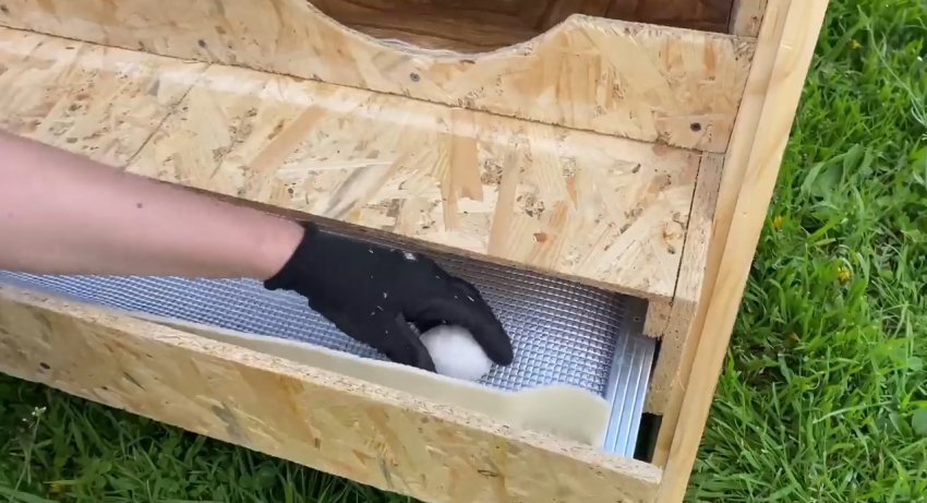 Наклонное дно рамки застилаем мягким утеплителем фольгированной стороной сверху безо всякого крепления. Это позволит в процессе эксплуатации гнезд время от времени вытаскивать его для очистки от различного мусора и дезинфекции.