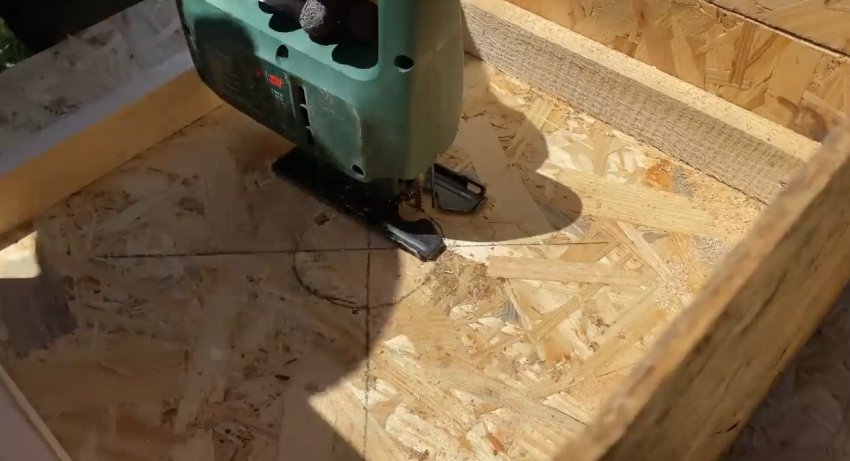 В гнездах по основанию проводим диагонали и находим их центры. С помощью круга диаметром 7 мм, вырезанного из OSB, в центре наносим окружности, которые затем вырезаем с помощью лобзиковой пилы. Шлифуем кромки круглых вырезов наждачной бумагой.