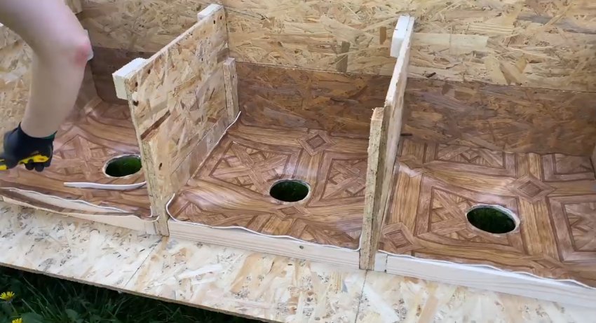 В каждое из трех гнезд укладываем линолеум в виде квадрата 41?41 см, предварительно проделав в каждом из них по центру отверстие диаметром 7 см. По периметру гнезда и отверстия в центре каждый кусок линолеума крепим соответственно к планкам и основанию строительным степлером.