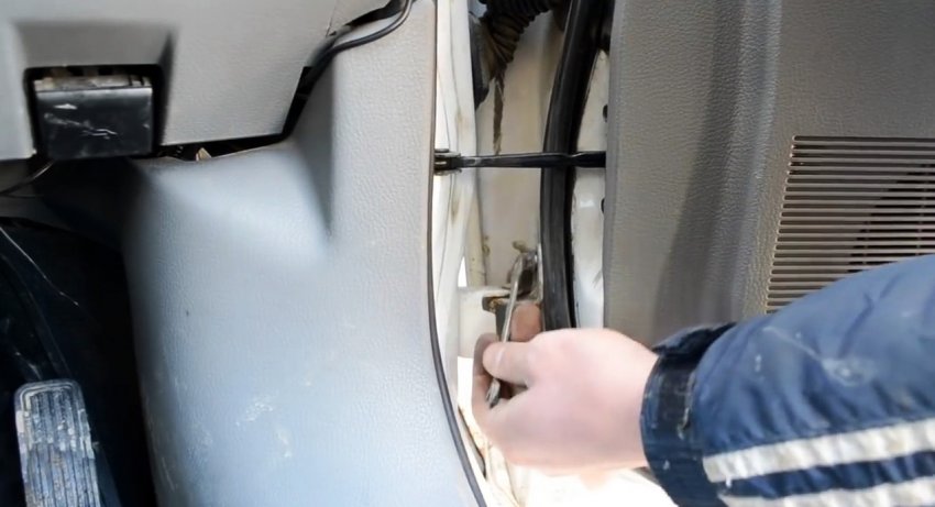 Откручиваем 2 болта крепления нижнего навеса к двери с помощью ключа на 12. Отметим, что практически на всех автомобилях крепление осуществляется с помощью болтов М12. Если болты за много лет эксплуатации, что называется, «закисли», то их предварительно обрабатываем смазкой WD-40 или принимаем какие-то дополнительные меры.