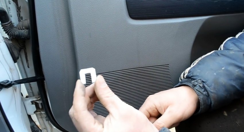 Из обычной жести нужной толщины, например из профнастила, вырезаем П-образные скобы, прорезь которых по ширине должна позволять свободно заходить на болты крепления дверного навеса. Для машины возрастом 15-20 лет обычно хватает четырех таких скоб.