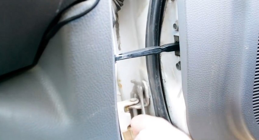Болты выкручиваем примерно на 2-3 мм не более. Болты, которыми прикручен навес к кузову не трогаем вообще, они нам абсолютно не понадобятся. Несколько расслабив нижние болты дверного навеса, мы временно получаем увеличенный люфт двери, который в дальнейшем будет полностью устранен.