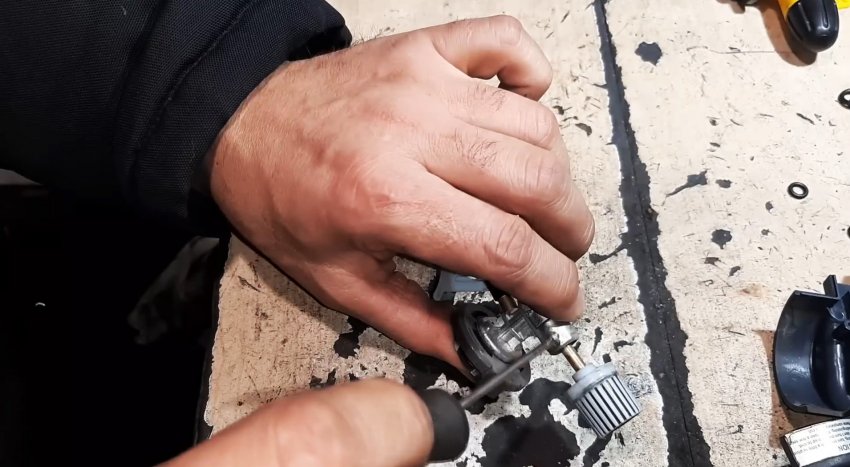 Чтобы её устранить, маленькой отвёрткой раскручиваем пластиковый корпус и снимаем его. Далее откручиваем фиксатор регулятора подачи газа. Полностью его удалять не надо, оставляем два-три витка.