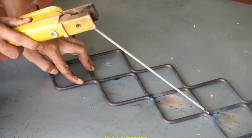 Изгибаем все заготовки, которые представляют собой зигзагообразные элементы с углами изгиба 90 градусов. Укладываем их на ровной поверхности так, чтобы они соприкасались друг с другом вершинами изгибов. Места соприкосновения прихватываем сваркой и защищаем болгаркой для получения товарного вида.