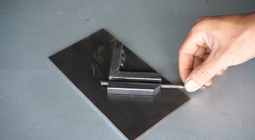 Параллельно одной из сторон прямого угла привариваем к плите такой же элемент из квадратного прутка, предварительно убедившись, что между ними свободно помещается 6-ти мм катанка.
