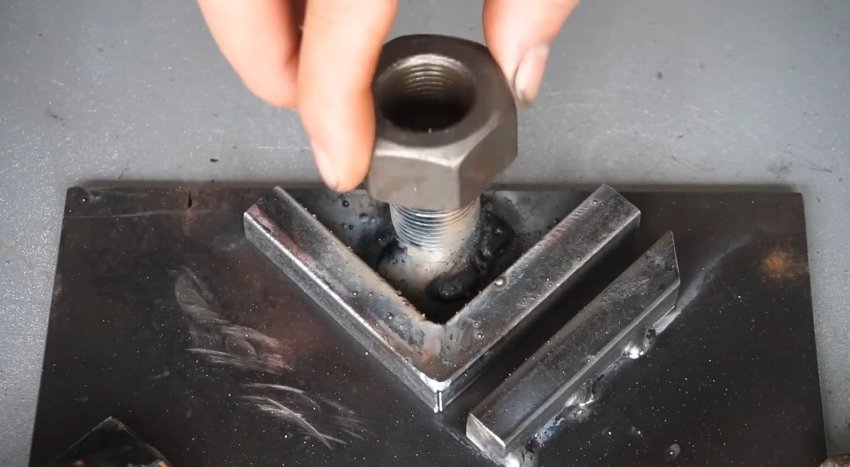 Во внутренний прямой угол двух квадратных прутков ставим вертикально резьбовой стержень и привариваем его к плите. На стержень накручиваем гайку. К одной из граней гайки под 90 градусов привариваем квадратный пруток расчетной длины.