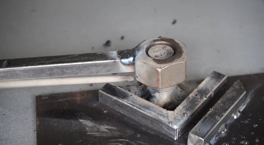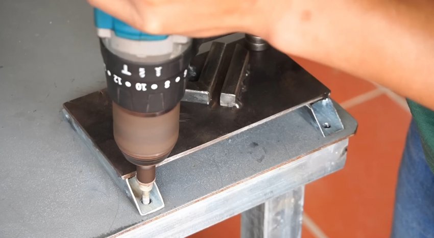 Вдоль коротких сторон плиты снизу располагаем 2 отрезка профильной прямоугольной трубы со скошенными торцами и производим их приварку к плите. Через отверстия в профильных трубах по четырем сторонам надежно прикручиваем наше приспособление к углу рабочего стола верстака.