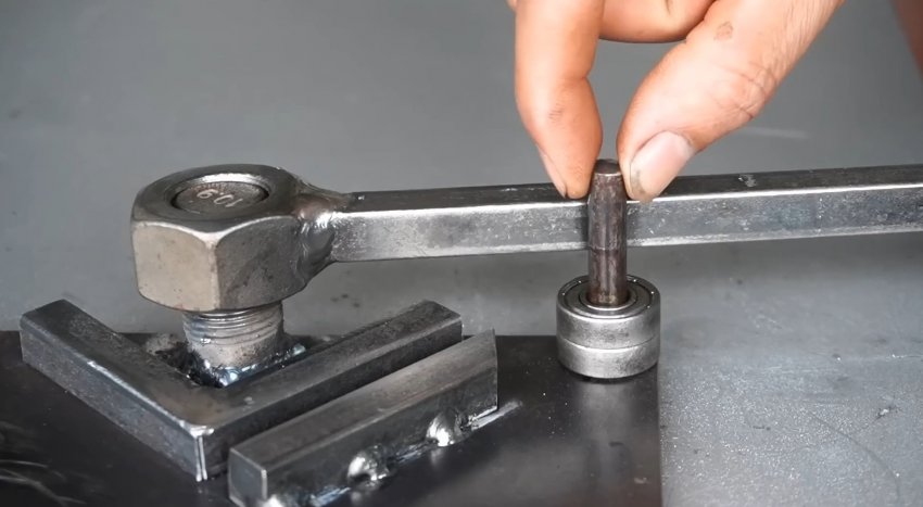 2 подшипника на оси устанавливаем пяткой на угол плиты. Отмечаем на оси низ квадратного прутка, приваренного к гайке. Укорачиваем ось по отмеченной метке и привариваем к низу квадратного прутка.