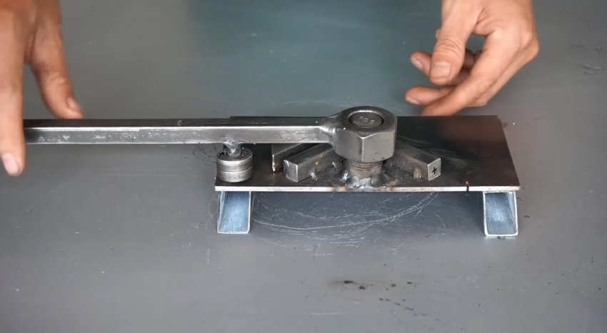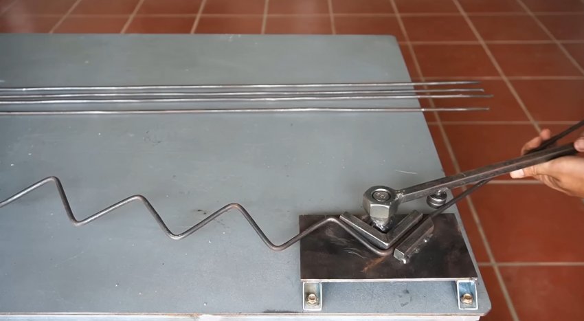 Работает приспособление очень просто. Отводим рычаг с подшипниками за линию, проходящую посередине между двумя параллельными отрезками квадратного прутка. Вставляем в зазор между ними конец заготовки из катанки и тянем рычаг в сторону прутка. Тогда подшипники, вращаясь, давят на катанку, и она изгибается точно на 90 градусов. Следующий участок катанки изгибаем в противоположную сторону, тогда как первый изгиб фиксируется вторым отрезком угла из квадратных прутков. Продолжаем процесс в такой последовательности, пока не дойдем до второго конца заготовки из катанки.