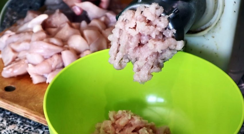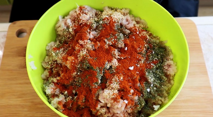 Куриное филе промываем и оставляем подсушиться на бумажном полотенце или хлопчатобумажной ткани. Делаем фарш, перемолов мясо в мясорубке. Добавляем все специи и воду, тщательно вымешиваем массу.