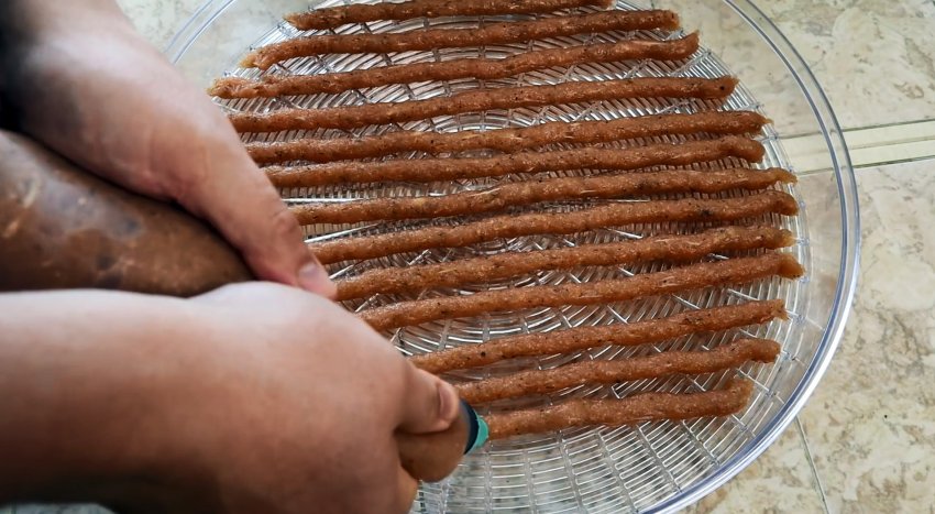 Если у вас нет сушилки, делать колбаски можно в электрической духовке, при температуре 60-70 градусов в режиме конвекции. Если используете этот вариант, формировать колбаски необходимо сразу на противень, на пергаментную бумагу. Но придется их через некоторое время перевернуть. Да и расходы на электричество, к сожалению, будут намного выше.
