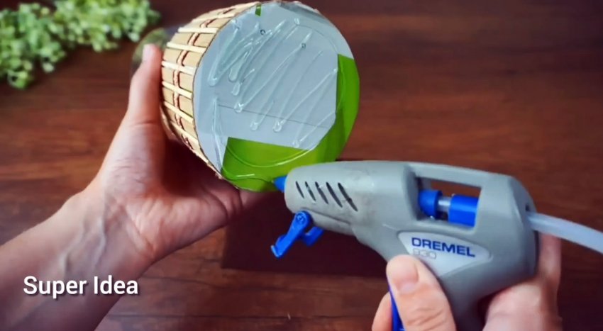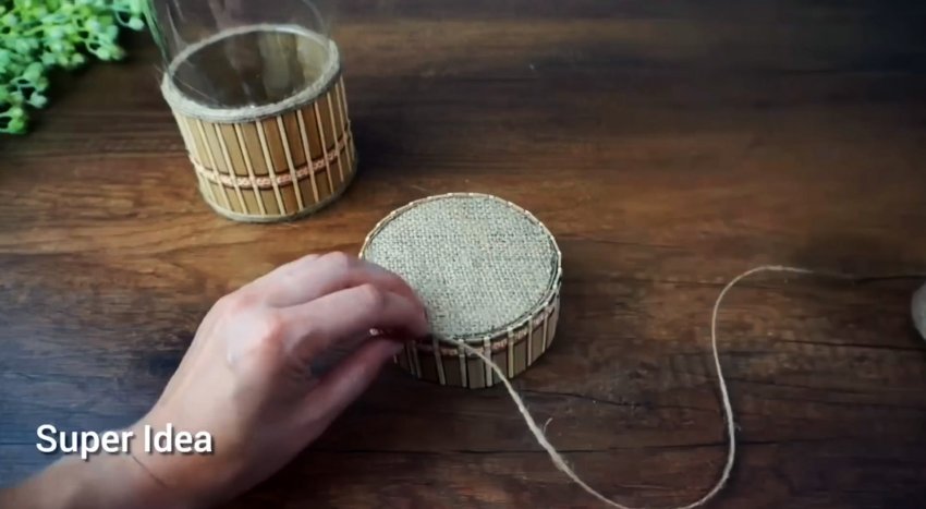 Отличие в том, что её не надо приклеивать к бутылке. Соединяем термоклеем боковину из циновки с крышкой из мешковины.