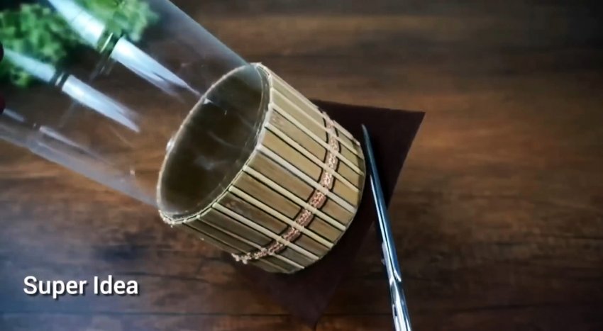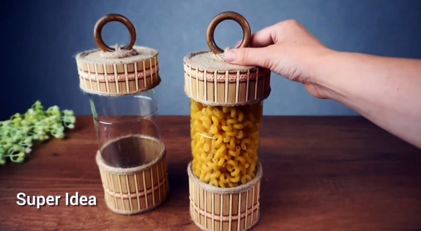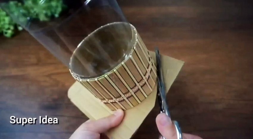 Дополнительно украшаем контейнер натуральным льняным или джутовым шпагатом. Он прекрасно сочетается в отделке с соломенной циновкой и мешковиной.