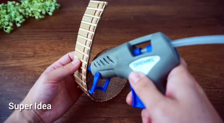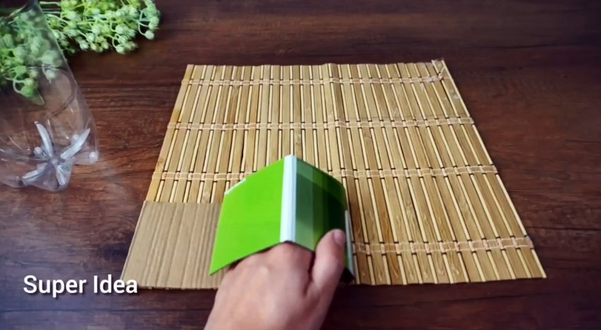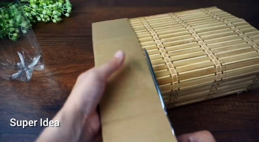 В качестве декоративной отделки возьмём циновку из соломки. Приклеиваем её к картону, используя термоклей. Лишняя часть циновки отрезается.