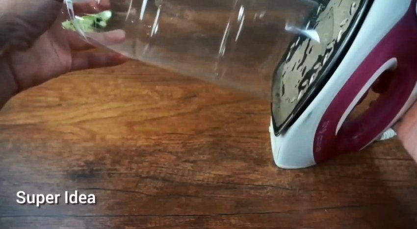 Линия отреза зависит от того, какого объёма контейнер вы хотите сделать. Если нужен большой – режем как можно ближе к горлышку, если маленький – режем ближе к дну. Линию среза обрабатываем горячим утюгом.