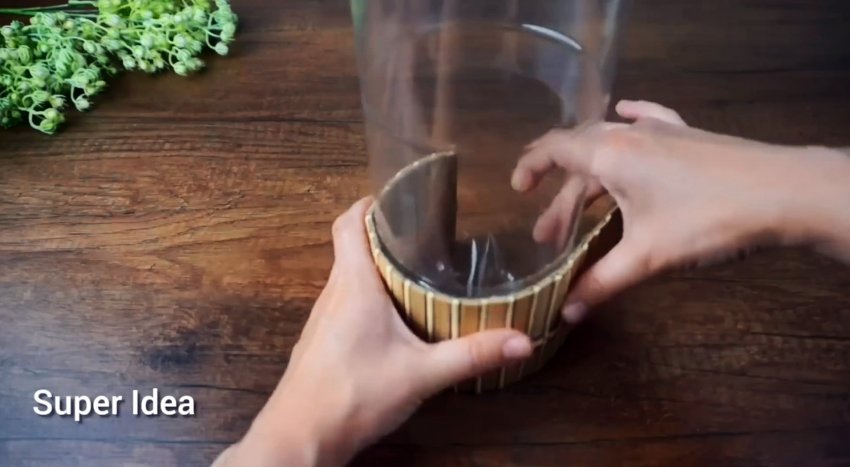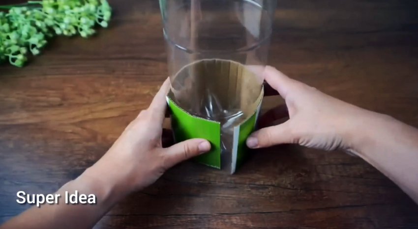 Получившаяся деталь приклеивается на нижнюю часть бутылки при помощи двустороннего скотча. Стык также обрабатывается термоклеем. Выглядит уже неплохо!