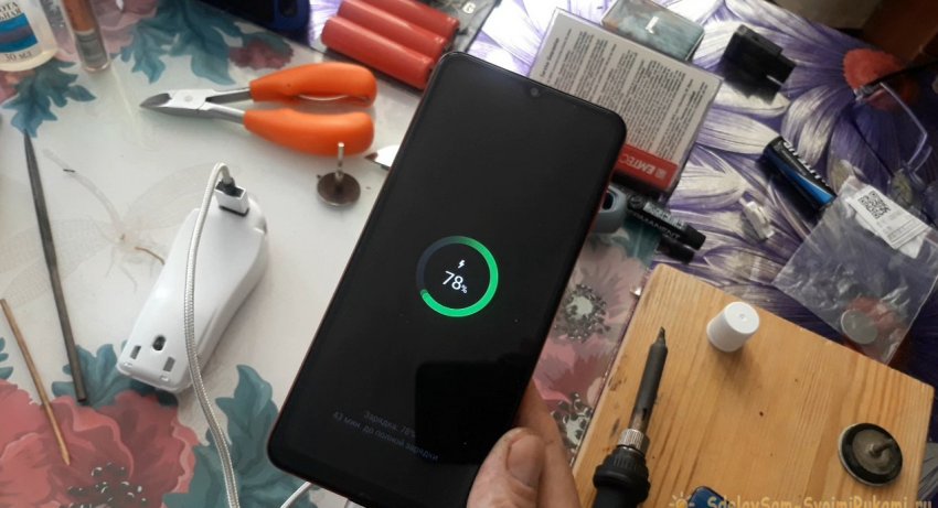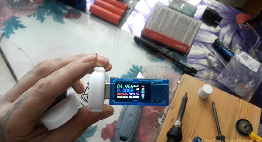 Если на выходе стабильное напряжение в пределах от 4,7v до 5,3v, то можно собирать корпус воедино. Подключаем для проверки телефон.