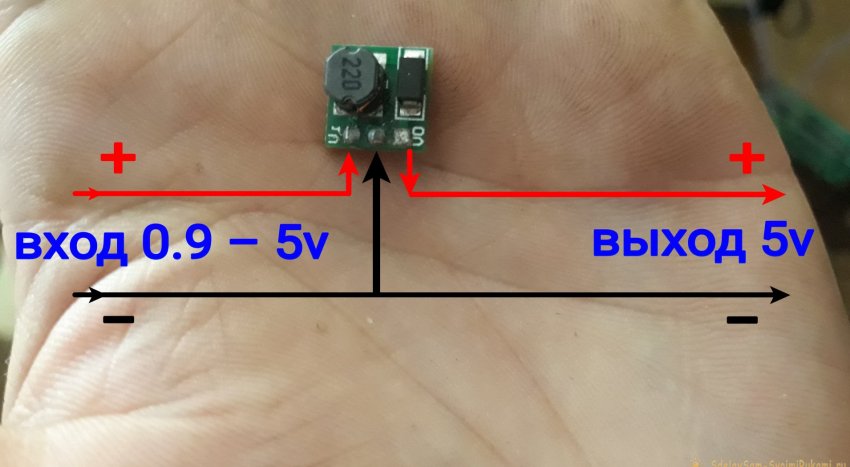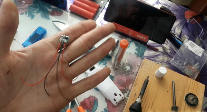 Можно конечно и просто приклеить на суперклей, но я всегда присыпаю клей содой – держит не хуже эпоксидной смолы, а застывает мгновенно! Теперь подготовим повышающий модуль, а именно – припаиваем к контактам проводку по длиннее, согласно схеме.
