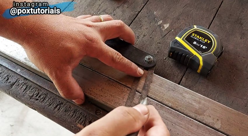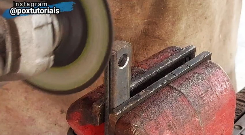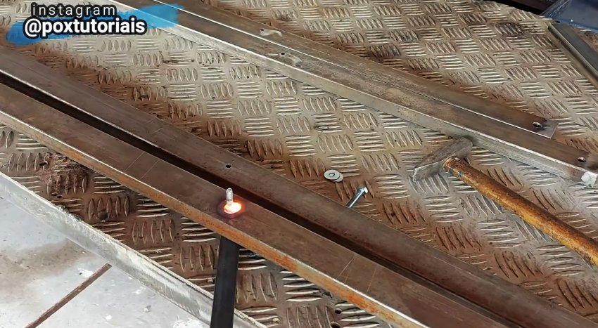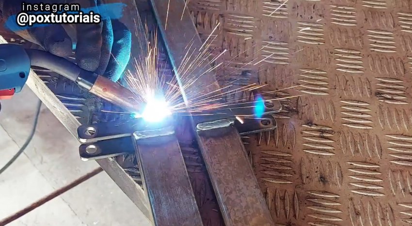 Из металлической полосы делаются упоры-ограничители для раскрытия стремянки. Всё закрепляется при помощи шайб и болтов, которые затем привариваются к боковым профилям.