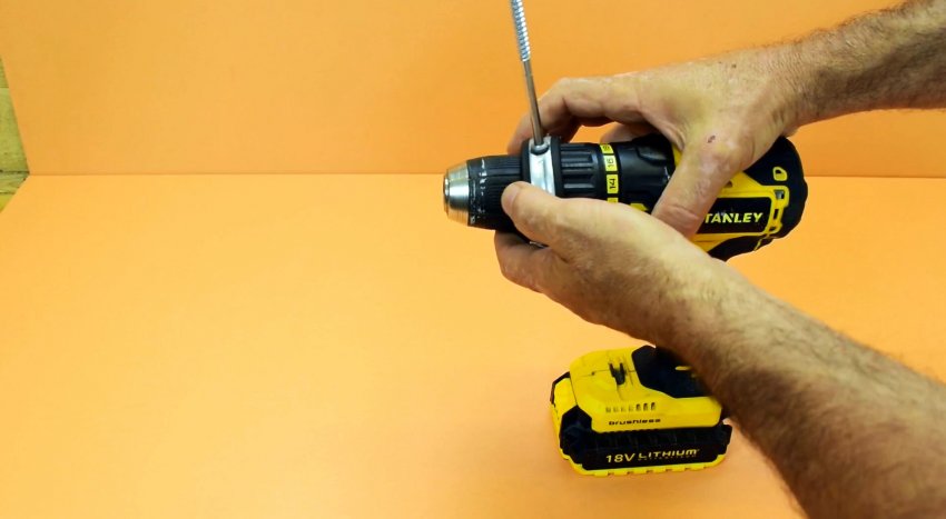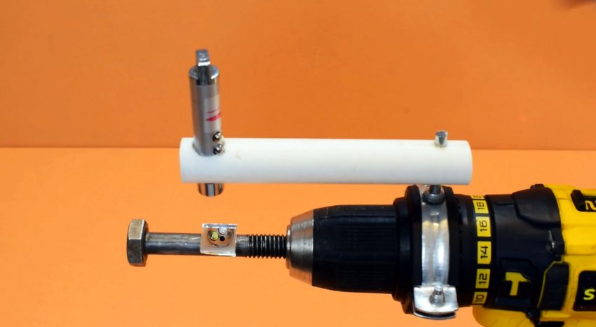 От трубного хомута с креплением на шуруп отрезаем резьбовую часть и закрепляем его на корпусе аккумуляторной дрели, закручивая стяжные винты с помощью ручной отвертки. Основание шурупа при этом должен быть направлен вертикально вверх.