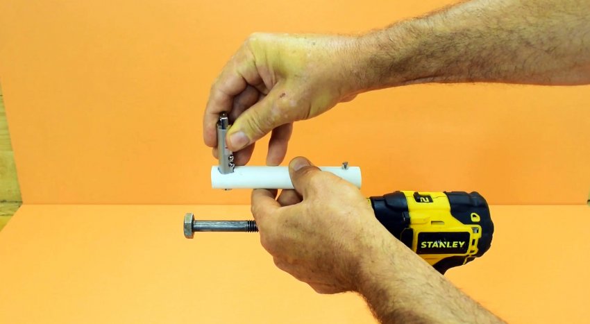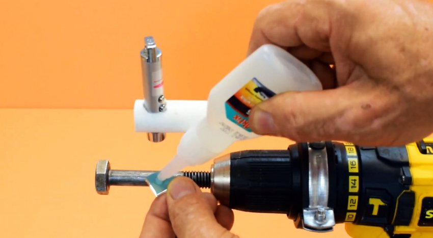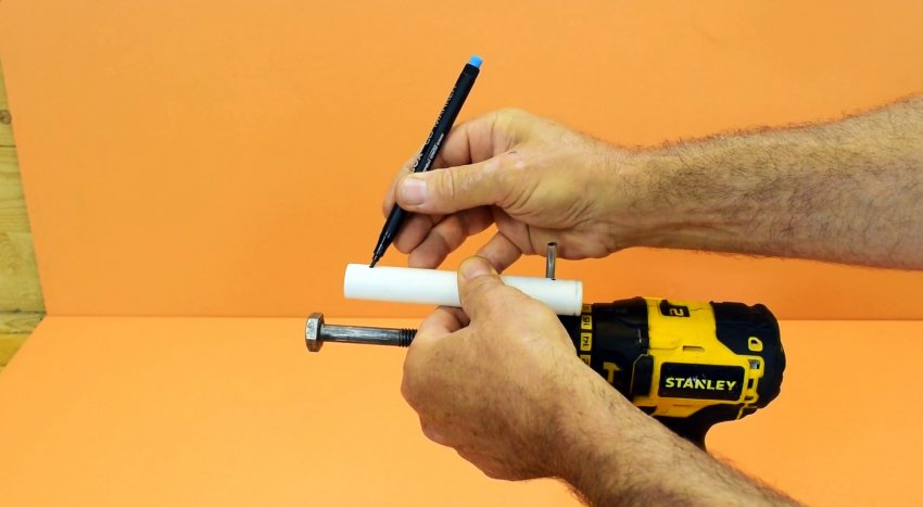 В патроне дрели закрепляем удлиненный стандартный болт головкой наружу. На концах пластиковой трубки сверлим одно сквозное отверстие под диаметр основания шурупа хомута, а второе – под наружный диаметр корпуса лазерного целеуказателя.