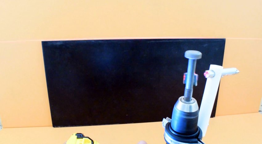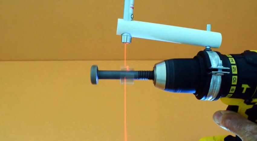 В принципе наш самодельный лазерный уровень готов к применению по назначению. Для этого включаем лазерный целеуказатель и подаем питание на дрель. Лазерное излучение, падая на вращающееся зеркальце, отбрасывает на вертикальную или горизонтальную поверхности визуальную лазерную линию, которая будет тем четче, чем большие обороты разовьет дрель.