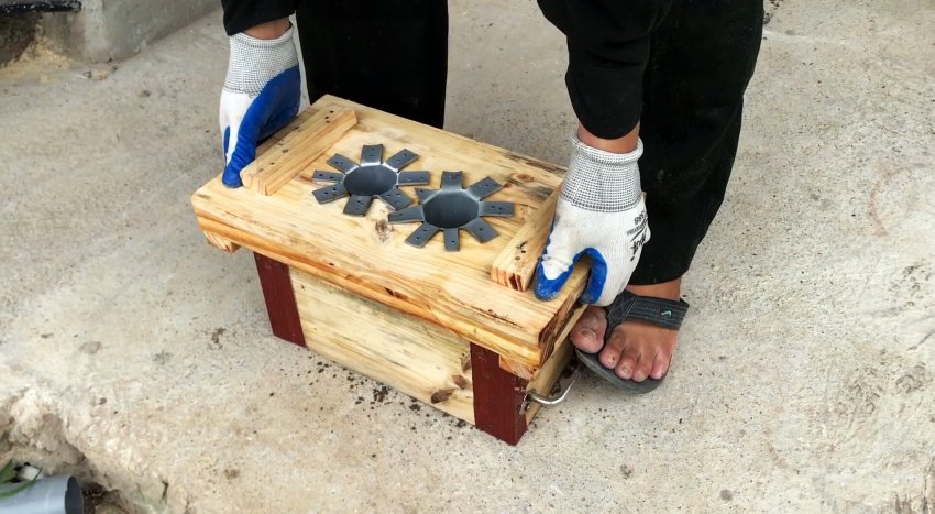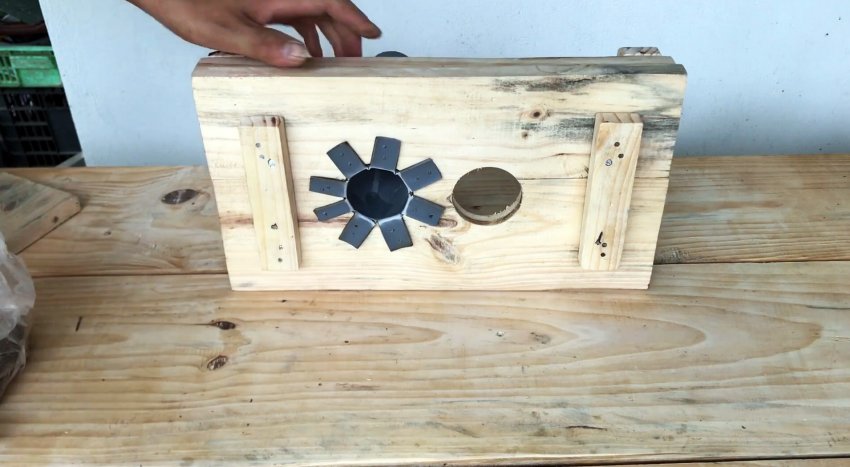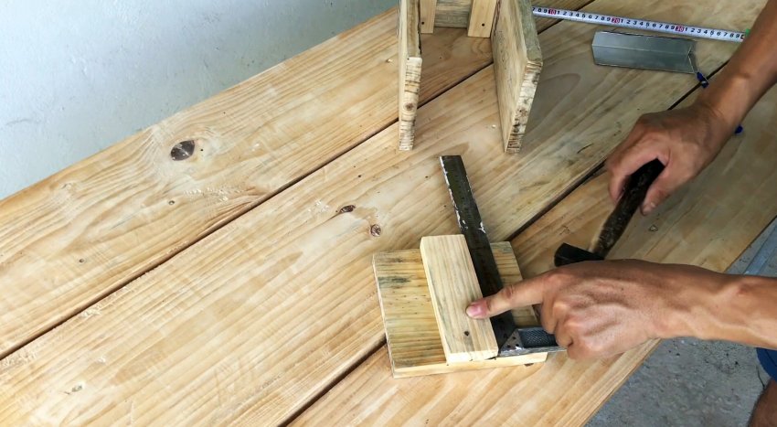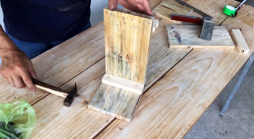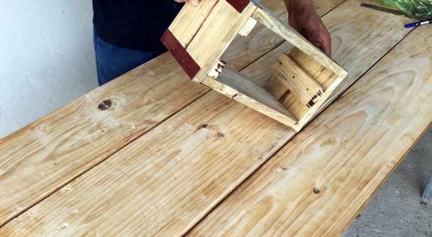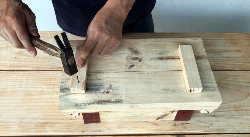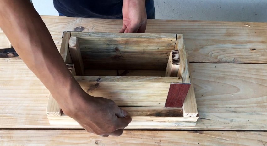 Из этих заготовок и 4-х металлических уголков длиной 15 см с помощью гвоздей собираем четырехугольный короб. В двух углах прибиваем гвоздями бруски шириной 3 см и длиной 15 см. К противоположной стороне по центру вертикально крепим гвоздями брус шириной 5 см и длиной 15 см.