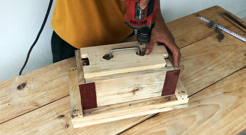 Ставим на место короб. К его крышке и бокам прибиваем дверные ручки.