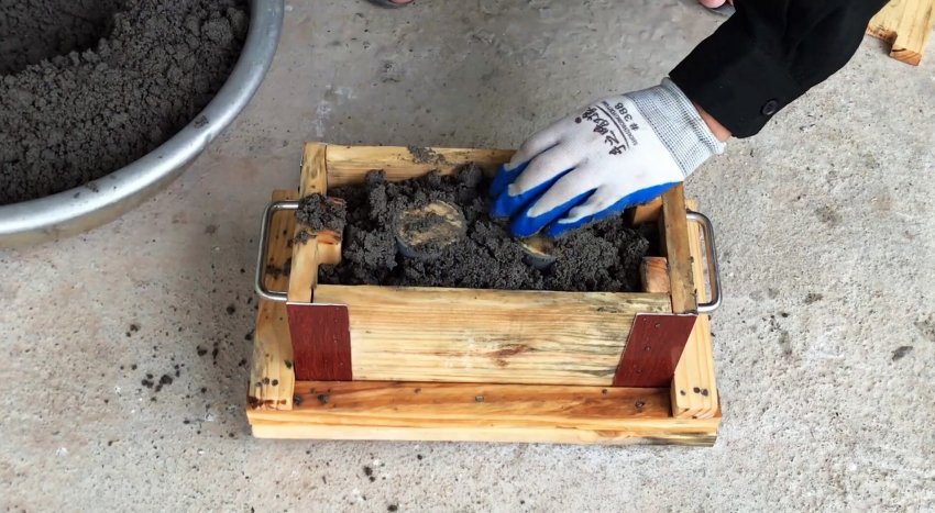 Смачиваем короб, дно и крышку водой. Замешиваем в емкости раствор из цемента, песка и воды. Заполняем им форму, периодически уплотняя раствор в форме встряхиванием.