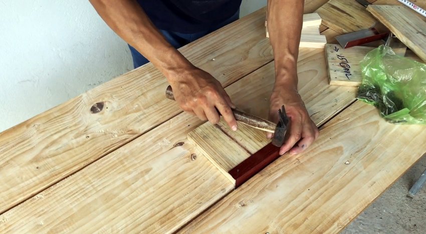 Переворачиваем сборку и к основанию из двух досок прибиваем поперек два бруска. Переносим внутренний контур короба на доски и убираем его.