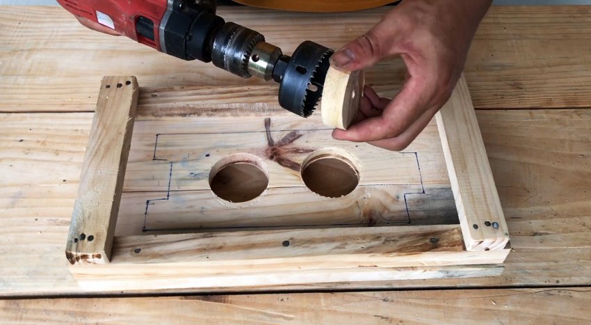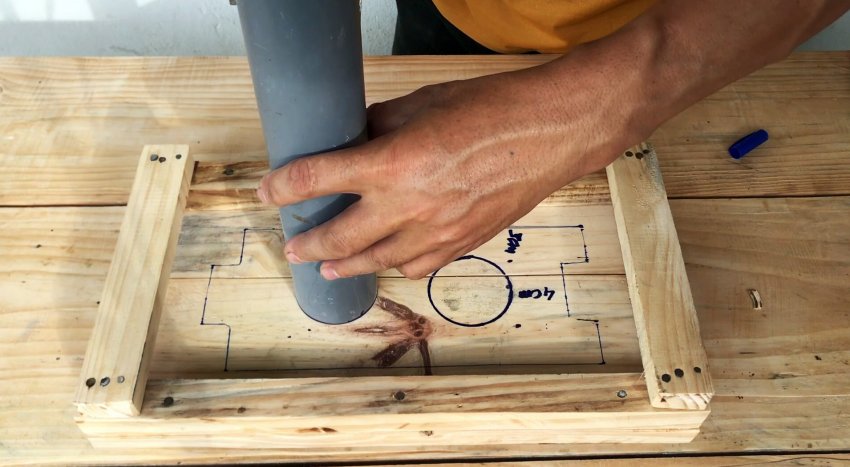 Высверливаем корончатым сверлом контуры пластиковых труб в досках. Вставляем в полученные отверстия пластиковые трубы до упора в столешницу и на уровне верха досок проводим маркером на трубах поперечные кольца.