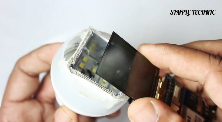 Итог работы – закрепление ЖК-экрана на изготовленном ранее новом отражателе светодиодной лампы. Всё тем же термоклеем.