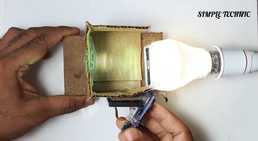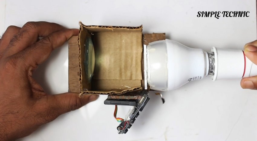 Чтобы транслируемое проектором изображение было больше размера спичечного коробка, необходимо установить дополнительную линзу. Все помнят старые советские телевизоры КВН? Никто не помнит… Ну, не важно. В помощь всё тот же картон и… термоклей!